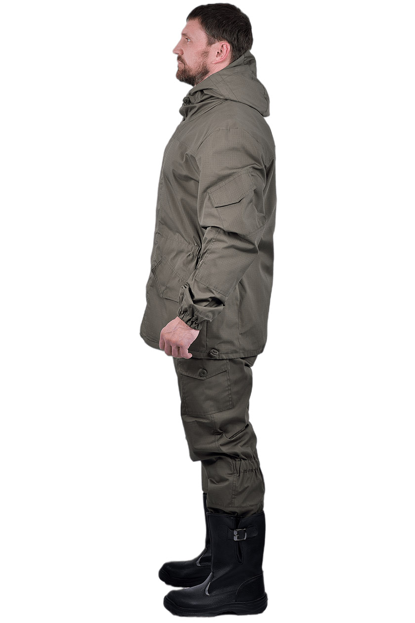 ➠ Куртка: крой прямой, супатая бортовая застежка на пуговицах. На полочках наклонные прорезные карманы с клапаном застегиваются на пуговицы. По линии талии расположена кулиса собранные на эластичную ленту. На рукавах накладные карманы с клапанами фиксирующиеся на контактную ленту, с манжетами. Области локтей усилены налокотниками. Внутренний карман на подкладке левой полочки.