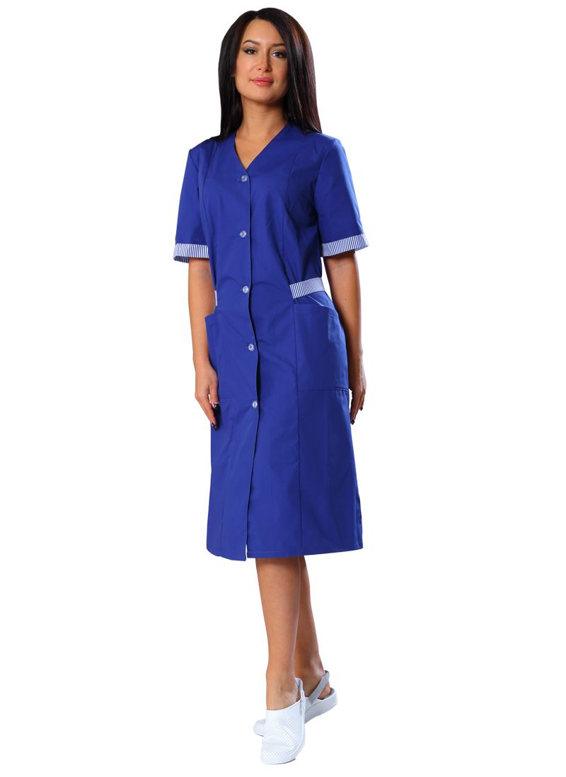 Халат с V-образной горловиной, с центральной бортовой застежкой на пять петель и пуговиц. Полочки с рельефами от линии плеча, с двумя нижними накладными карманами. Верхние срезы обработаны обтачками. Спинка с хлястиком. Рукава втачные одношовные, короткие, с отделочными манжетами.