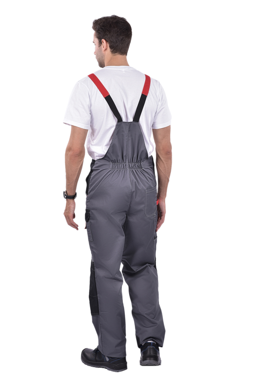 ➠ Полукомбинезон: в правом боковом шве застежка на пуговицу, в среднем шве на «молнию», карман с клапаном на грудке, боковые карманы с отрезным бочком. Колени усилены накладками, заложены по 2 вытачки. Один карман над левым наколенником. По шву наколенников косые, фигурные вставки СОП.