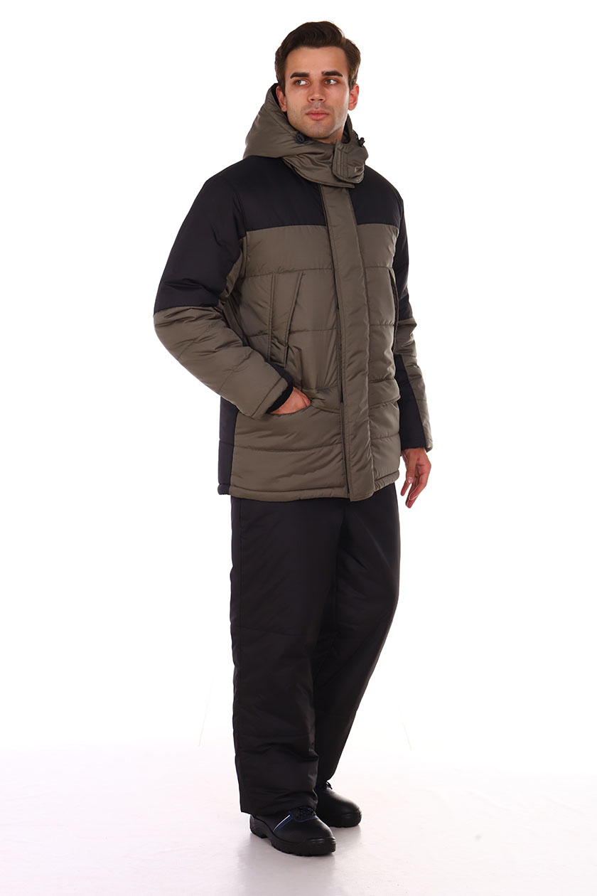 Центральная бортовая застежка на 2-х замковую молнию, закрытая двумя ветрозащитными планками, потайной карман на молнии.